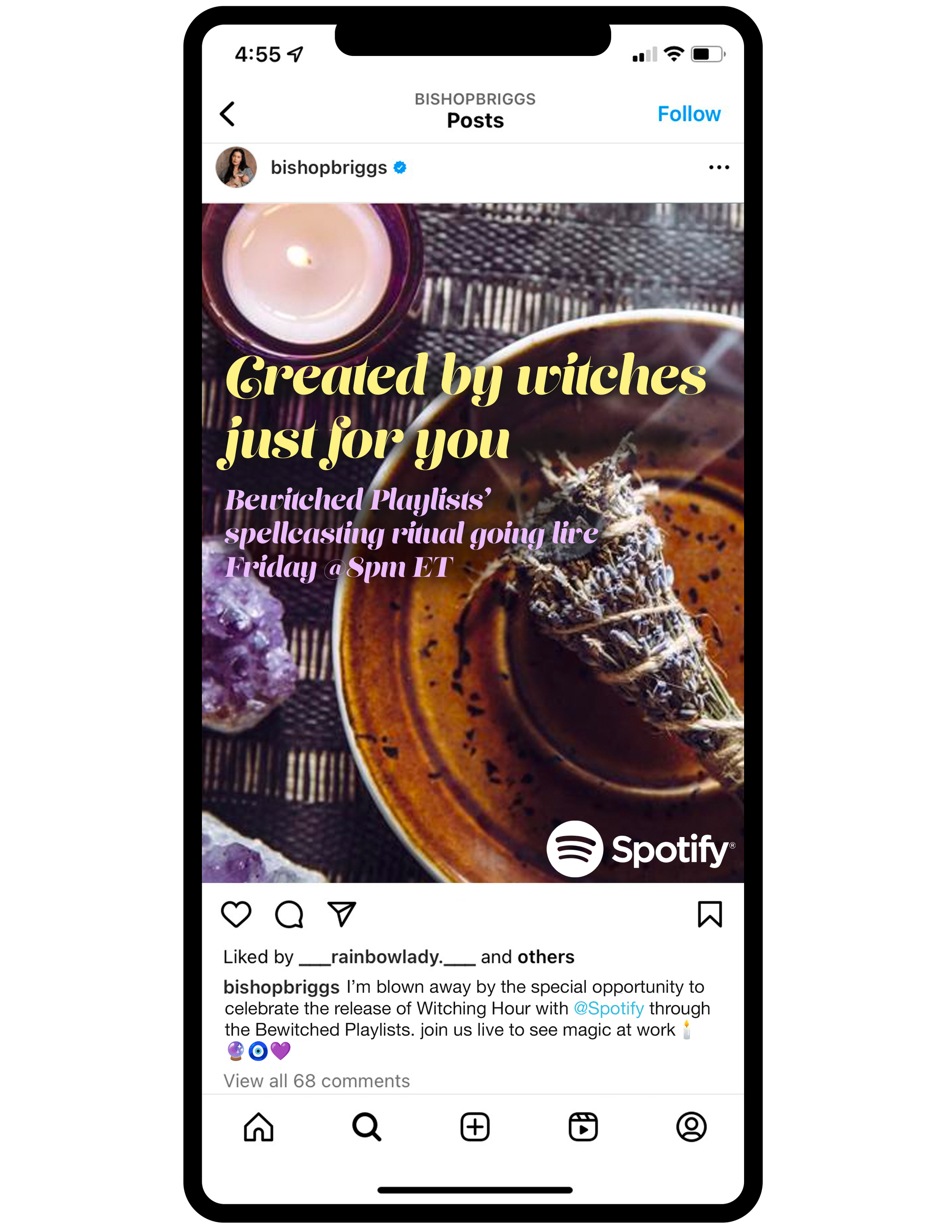 These rituals will be recorded via IG Live so anyone can watch the magic happen. Once these Bewitched Playlists are live and someone listens to an entire playlist, a special witchy emoji will then be added to their profile name on Spotify to show that the spell is in full effect.